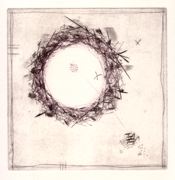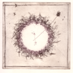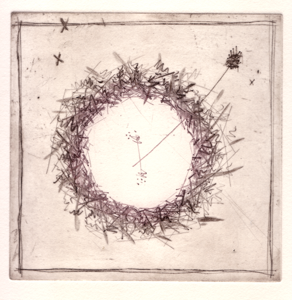A pair of images created on zinc plates each one having a round drypoint image on – Solar I & Solar II. These were made to compliment the MDW series started at the Solarplate course which I attended recently. Now in proofing stage. And then there were three!
