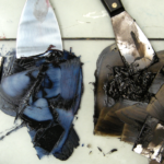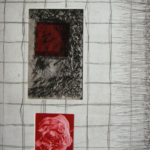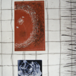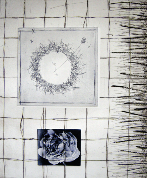 A combination of three plates – the background is a drypoint on zinc, the overlayed image is both photo-polymer and chine-colle or another drypoint, the third element is a small solarplate plate of a peony flower.